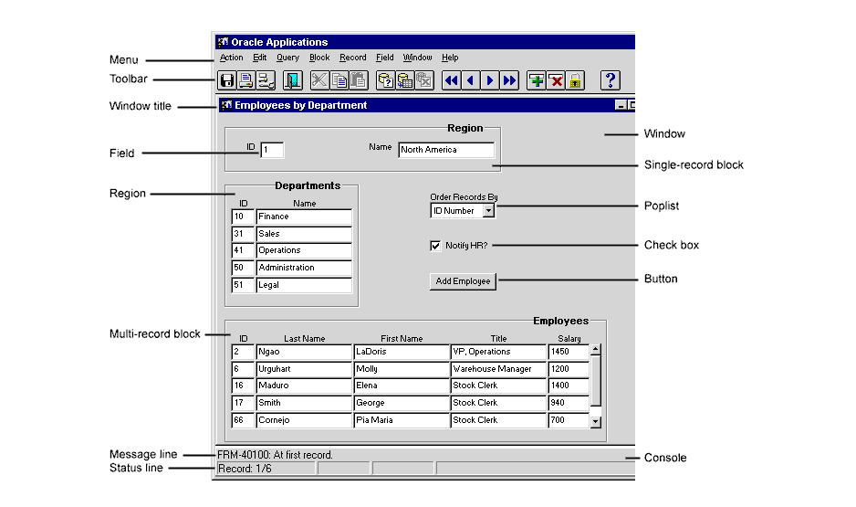 There are two types of blocks: a data block, which serves as a link between the datasource and the user, and a control block, which is not associated with a datasource. Each data block can enable the user to view and access data from one table in the datasource. Blocks can be single-record blocks, which means that they show one row of data at a time, or multi-record blocks, which enable users to see many rows of data at once. All of the fields in Figure 2-4 are in single-record blocks.
