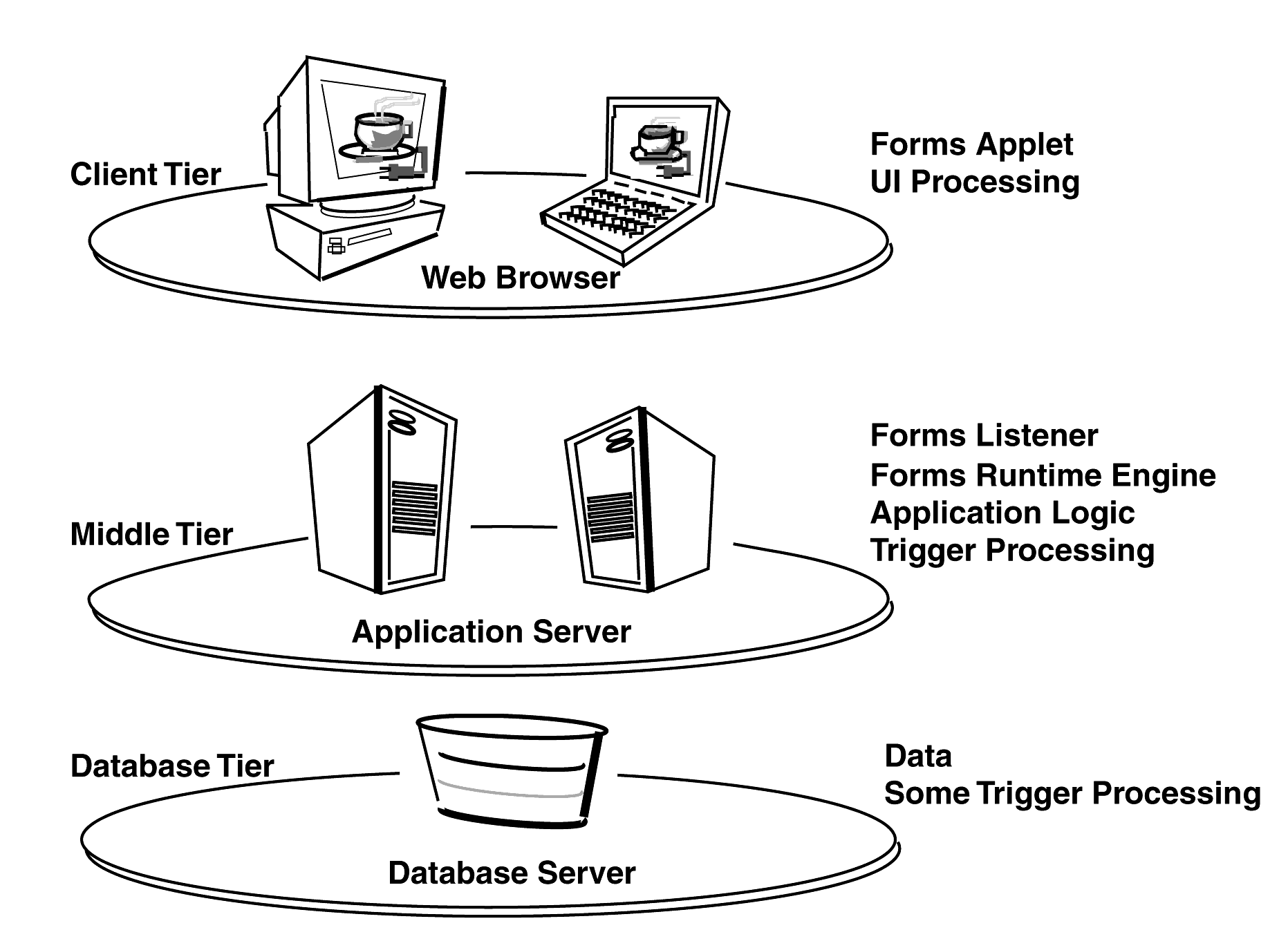 In a Web-based implementation, shown in Figure 8-2, the Form Services Runtime Engine and all application logic are installed on application servers, and not on client machines. All trigger processing occurs on the database and application servers, while user interface processing occurs on the Forms client, located on users' machines.