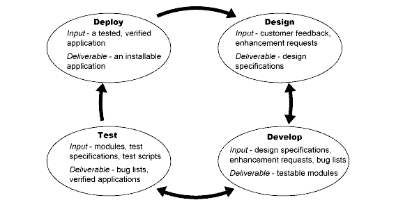 As the application grows in size and complexity, the four phases are repeated iteratively, and the amount of information produced (actual code, bug reports, enhancement requests, etc.) grows. Yet all input and deliverables for all phases must be tracked and maintained to ensure the integrity of the final deliverable: the application your customer installs.